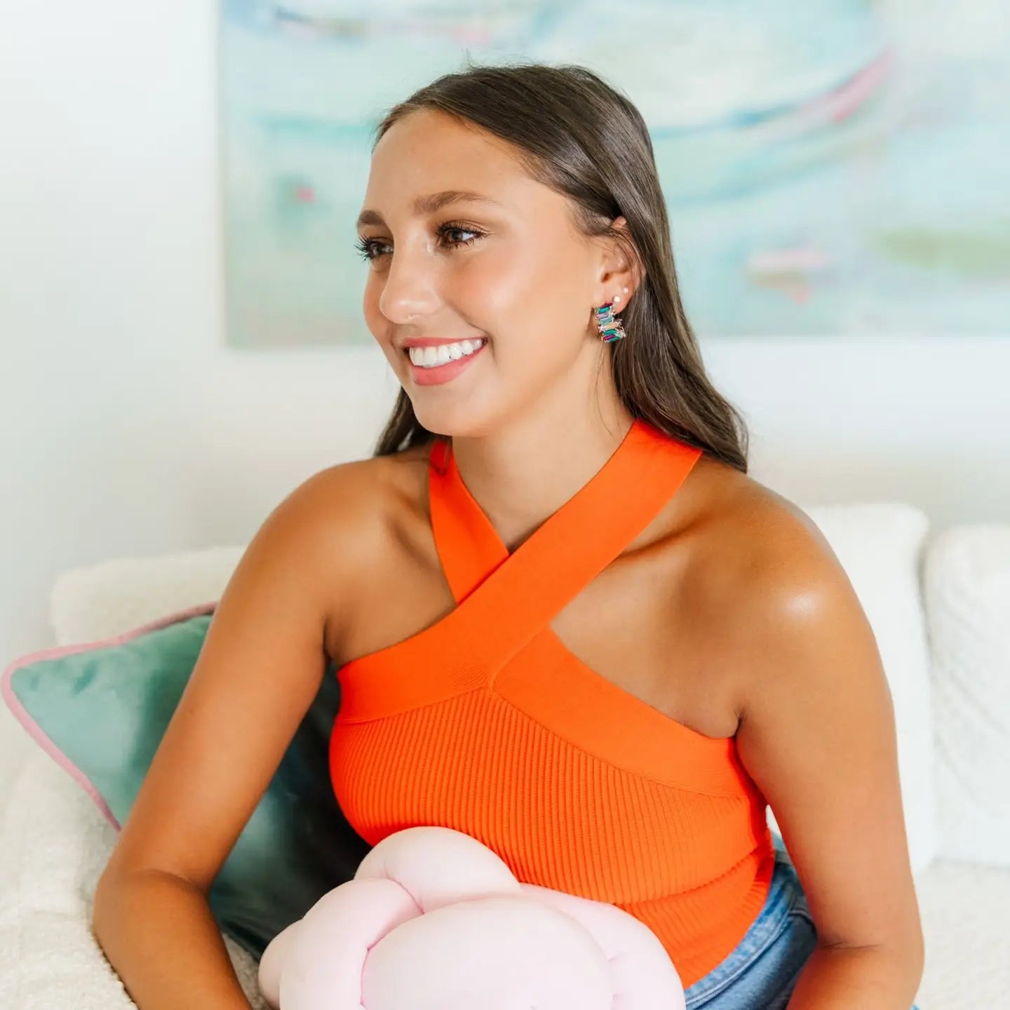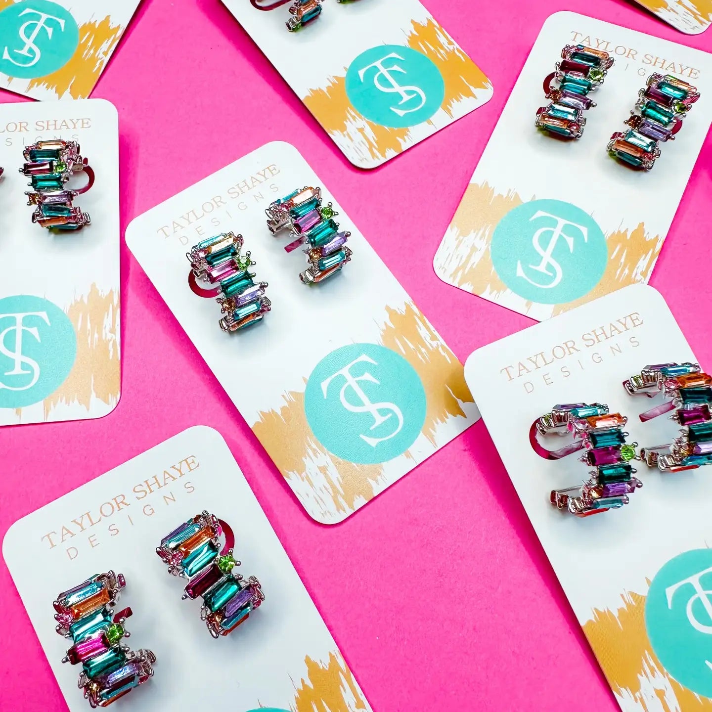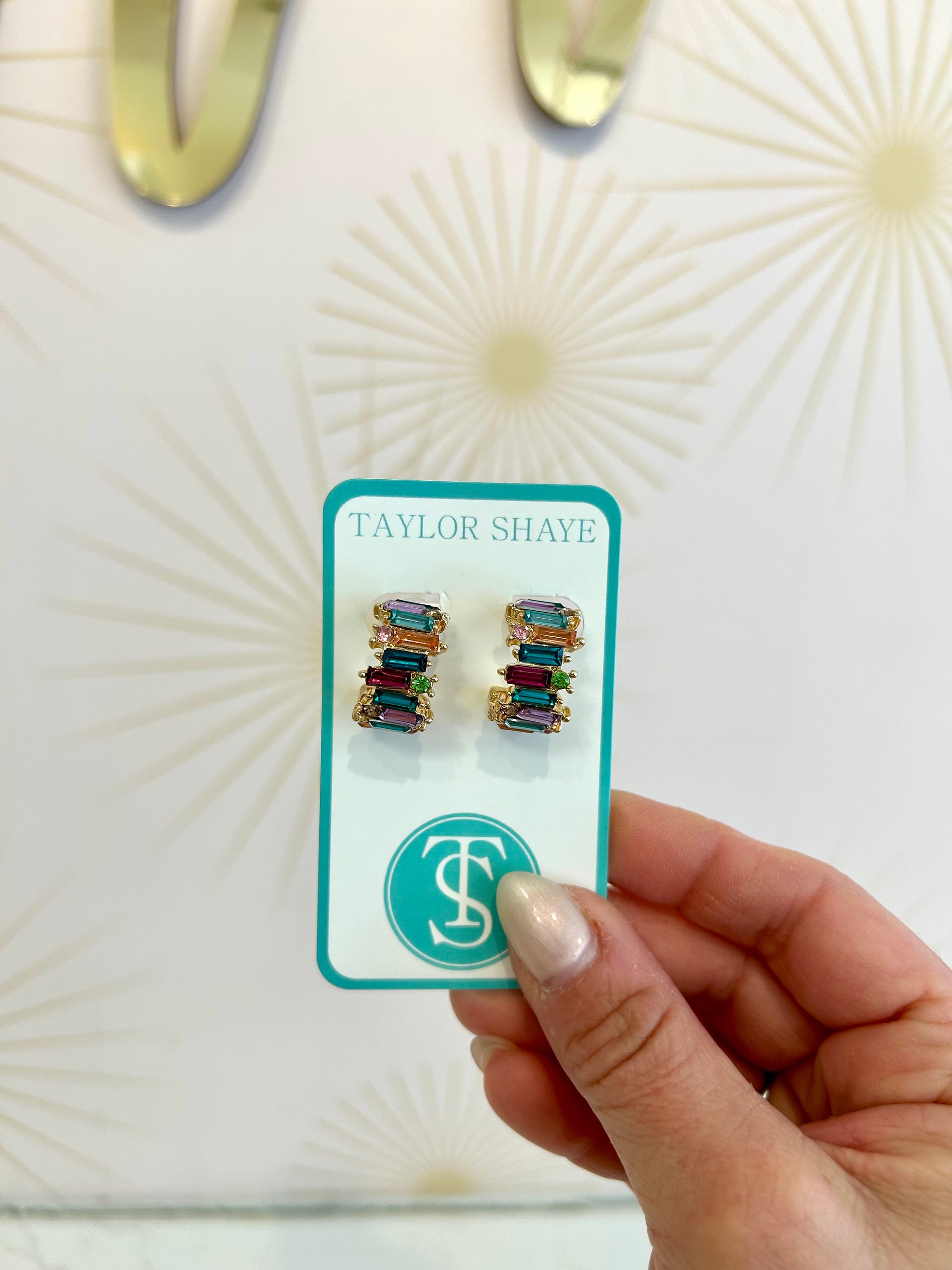 Multi colored jems with gold inlay. Experience the elegance of simplicity with our Aria Hoops from Taylor Shaye Designs. These hoop earrings are a timeless piece that brings a touch of sophistication to any outfit. Designed with the modern woman in mind, they make for an excellent addition to your jewelry collection.