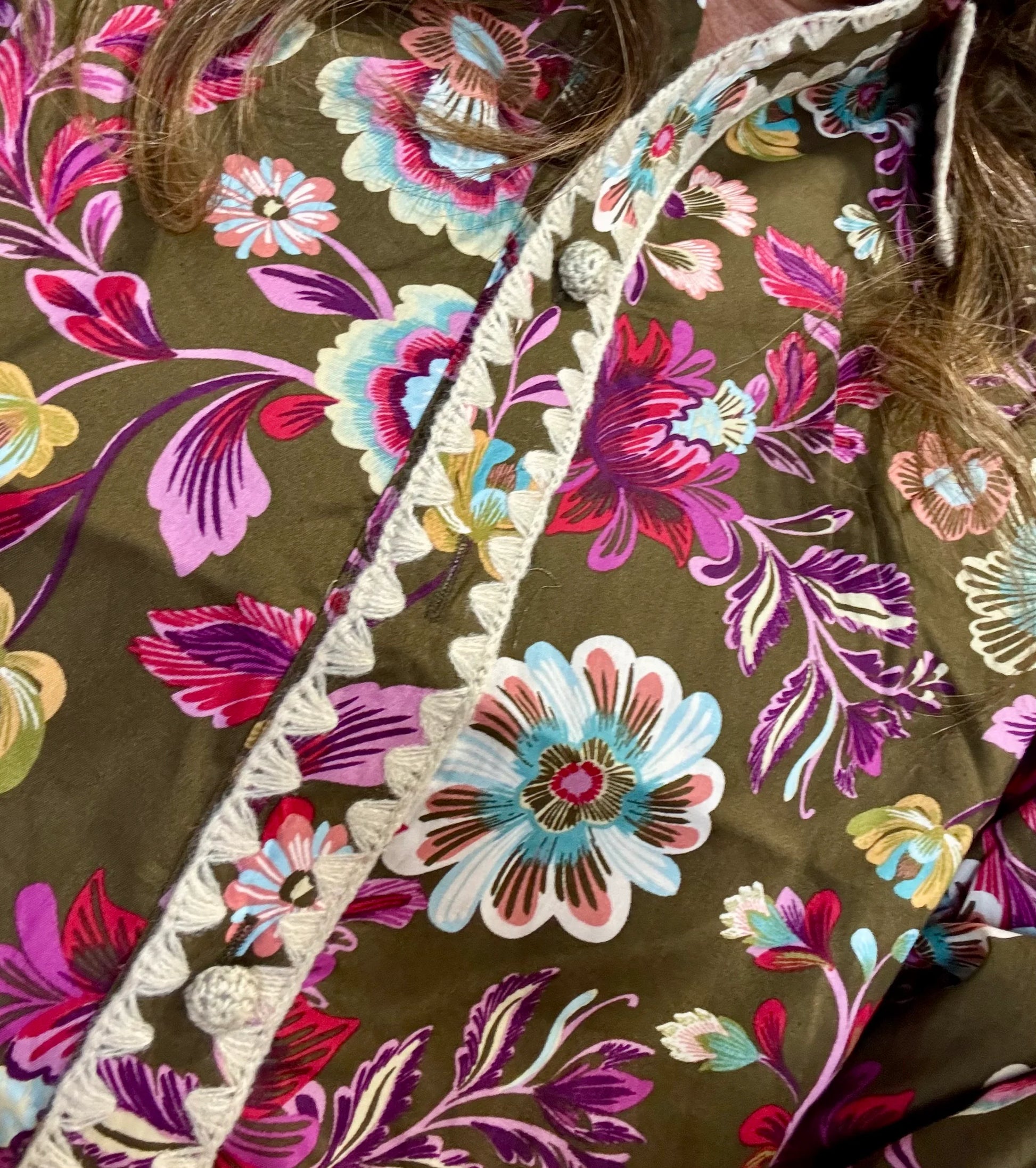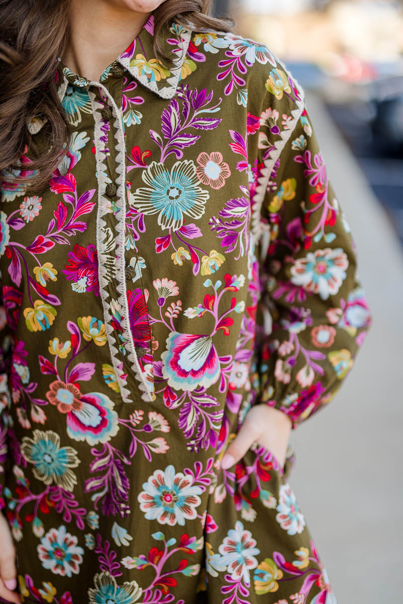Blanket triangle stitch button down mini dress; Collared neckline with contrast blanket triangle stitch + Half button down placket with contrast blanket triangle stitch + Long puff sleeves with elastic cuffs + Blanket triangle stitch on shoulders and hem + Pockets + Lined