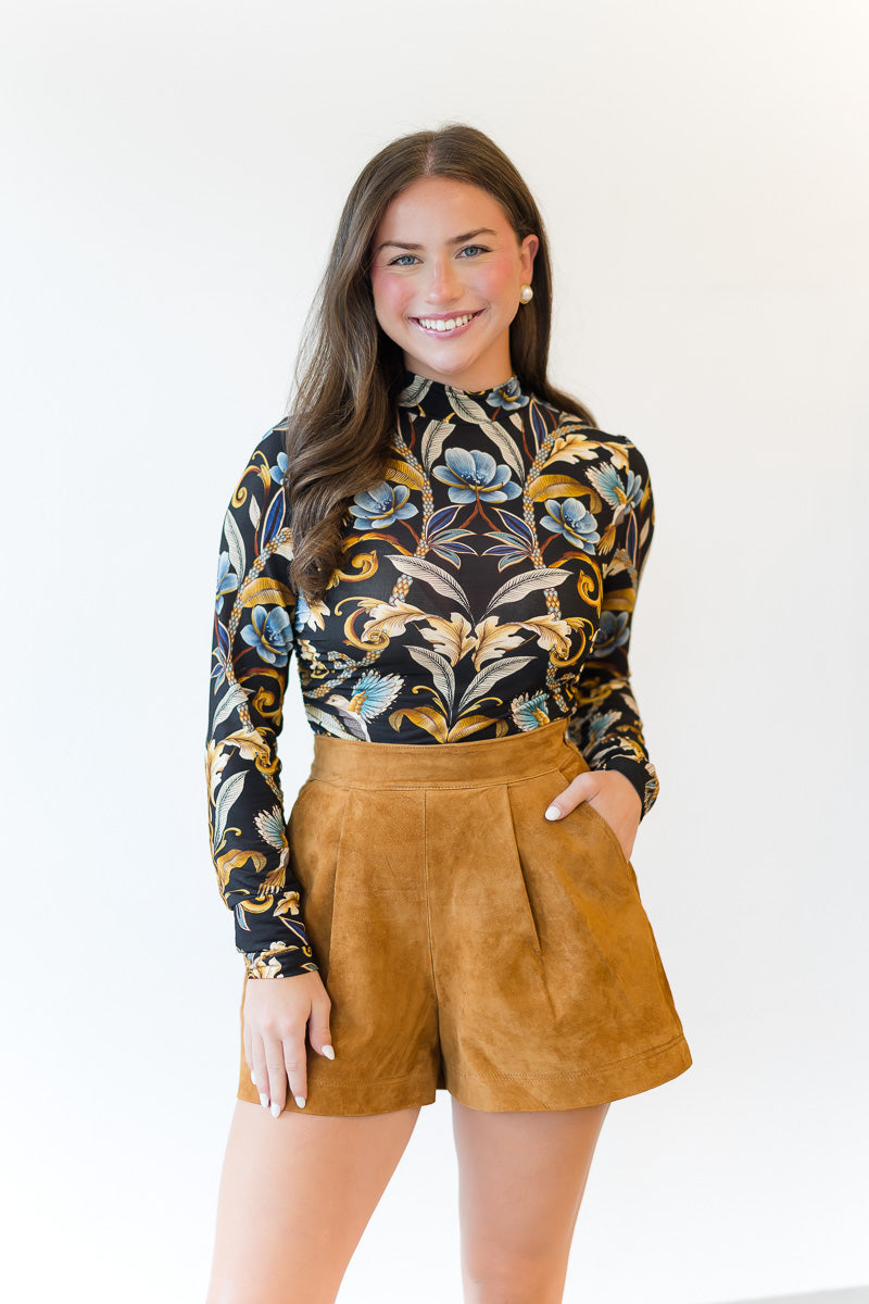 The Black Flowerful Garden Jersey Blouse from FARM Rio enchants with its rich black base adorned by an intricate floral and foliage pattern in soft blues, golds, and earthy tones. Featuring a graceful high neckline and delicately ruched sides, this long-sleeve top embraces a feminine silhouette that melds comfort with playful elegance. Its vibrant botanical design evokes a lush garden afternoon, perfect for layering warmth and charm into your everyday look. 85% RAYON 15% ELASTANE