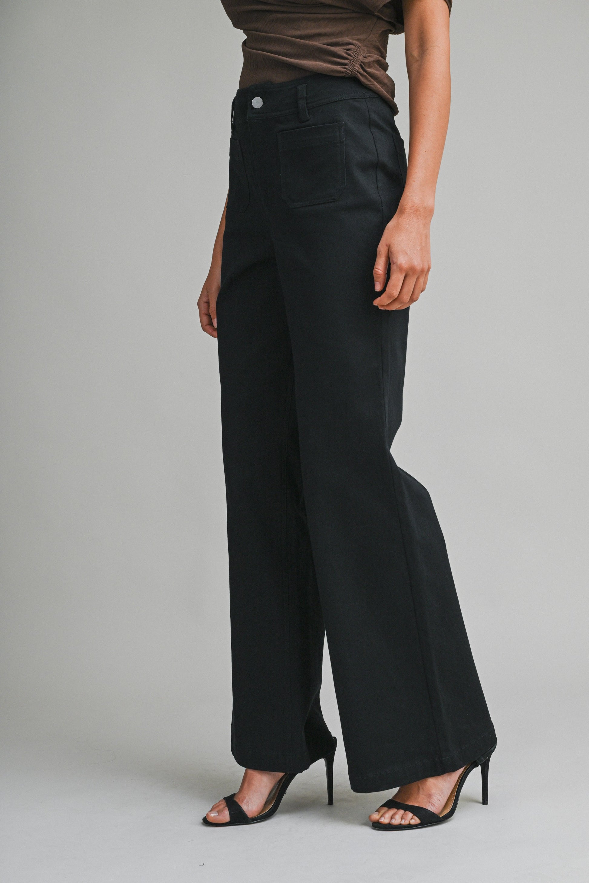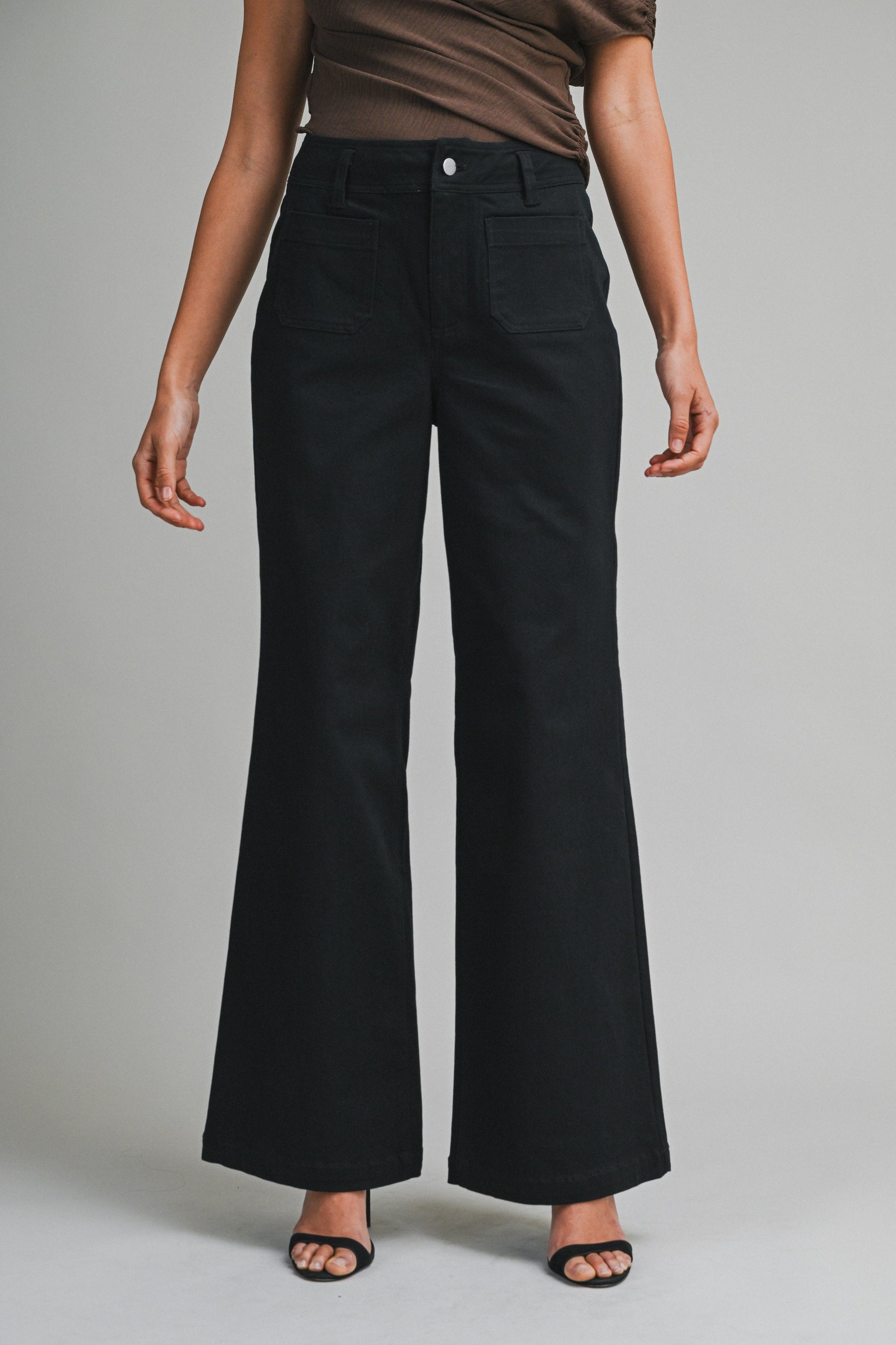 High waisted wide-leg flare trousers with front and back patch pockets, belt loops, and a button-zip closure. 94% COTTON 6% SPANDEX
