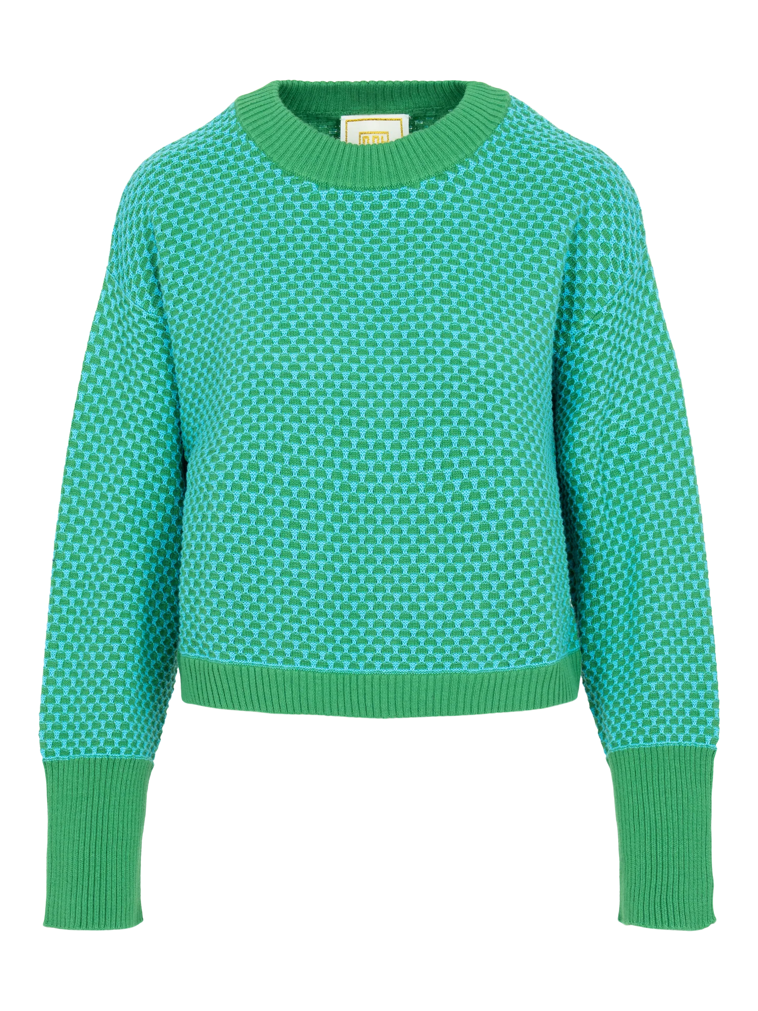 Boxy Sweater in Jellybean. Crew neckline; Tailored long sleeves; Loose boxy silhouette; 95% Cotton / 5% Cashmere; Hand wash with gentle liquid or powder detergent. Cold water will help preserve color & shape. Lay flat to dry.