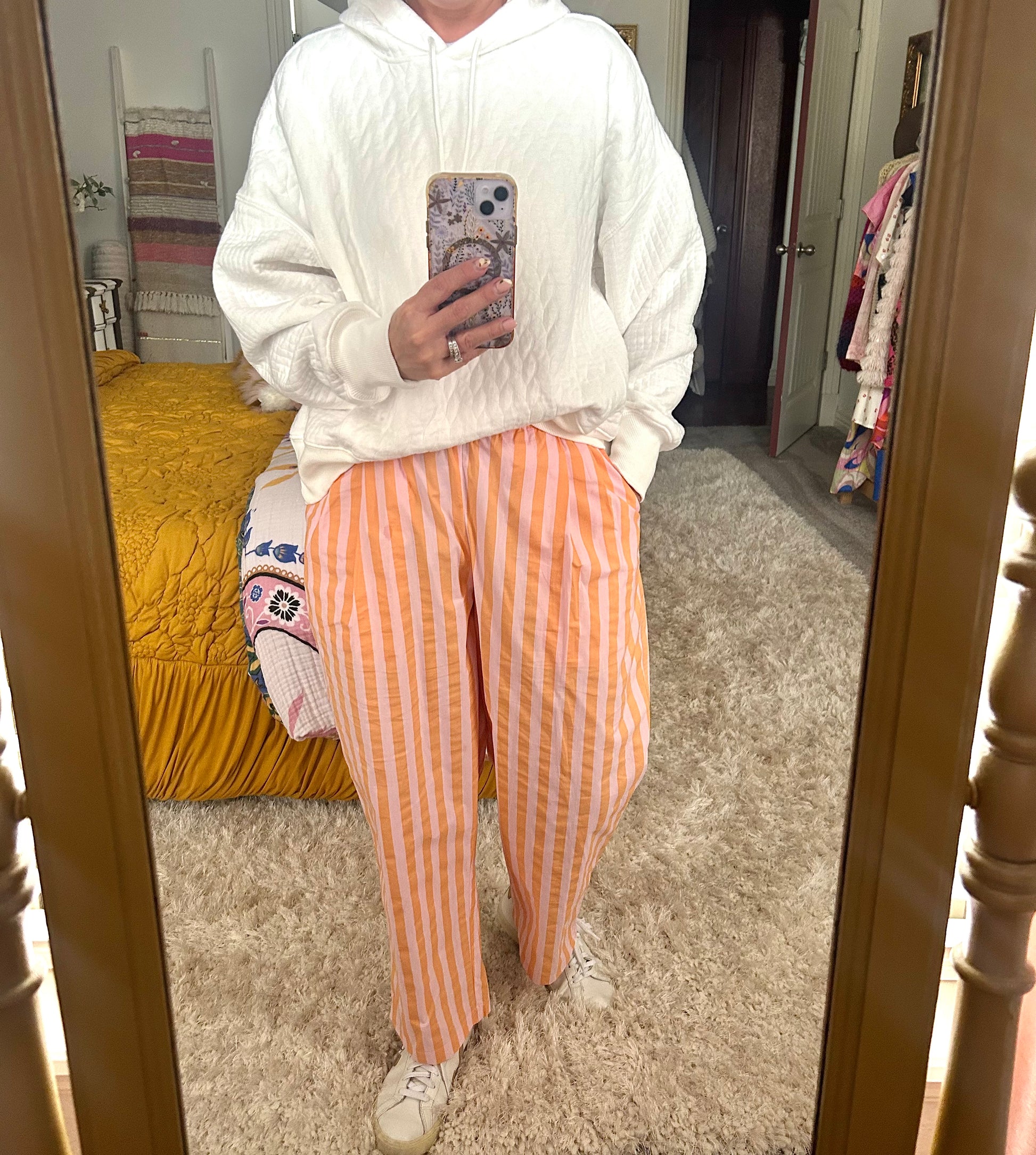 These soft Orange/Pink Stripe boot cut Bryan pants emulate effortlessness. Featuring delicate pleat details and handy front pockets, they blend charm with practicality. The wide waistband ensures all-day comfort, making them perfect for any occasion. Pair with the Gemma top for a chic matching set look that’s both fresh and timeless