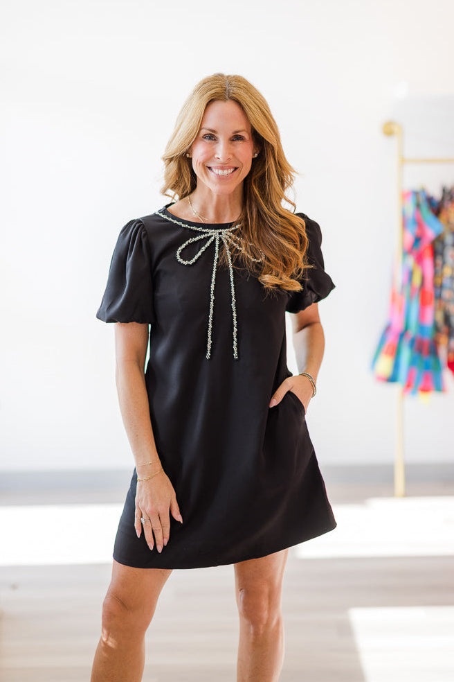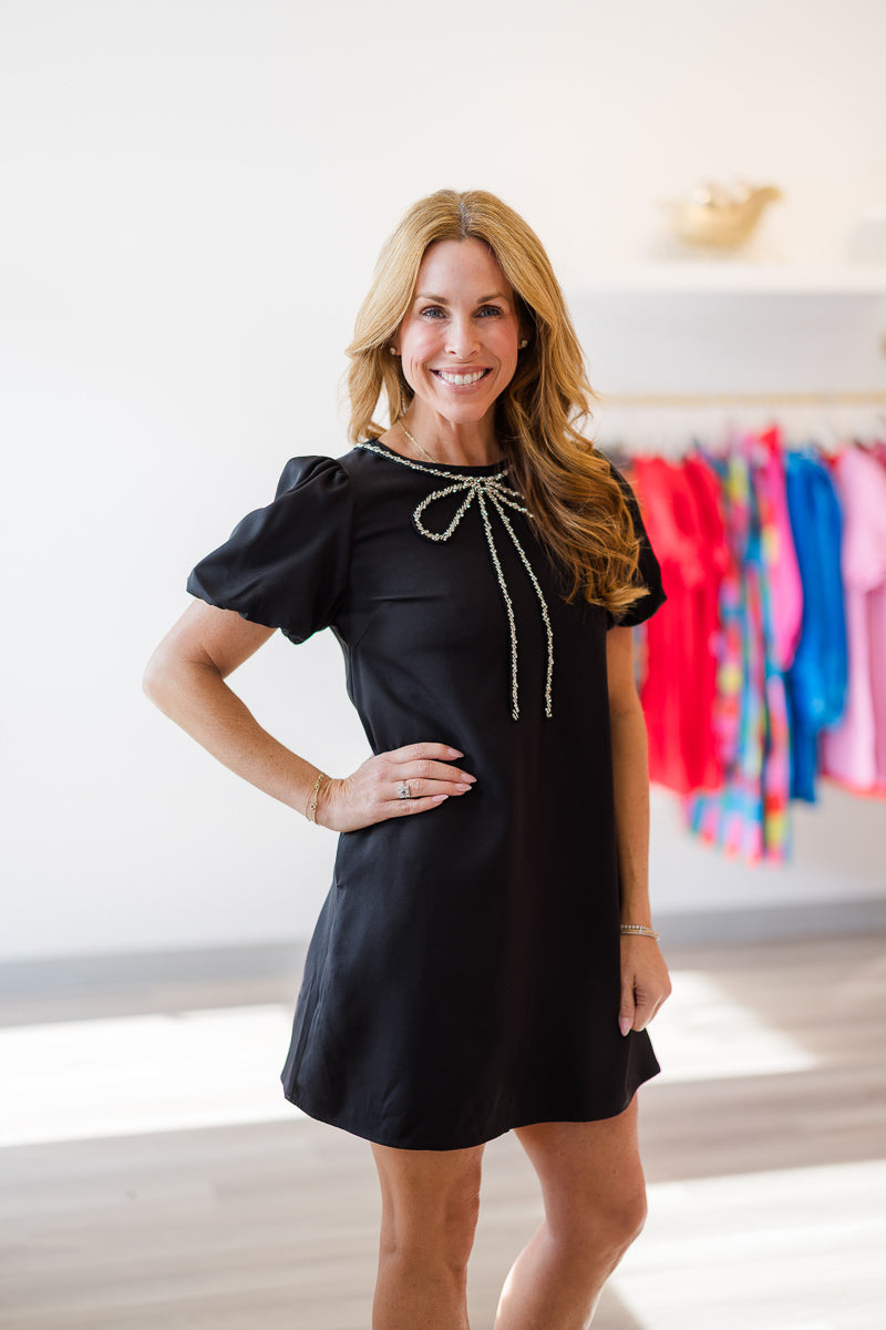 Playful and polished, this mini dress pairs charming puff sleeves with a round neckline crowned by a dazzling crystal bow. A fun twist on timeless style.