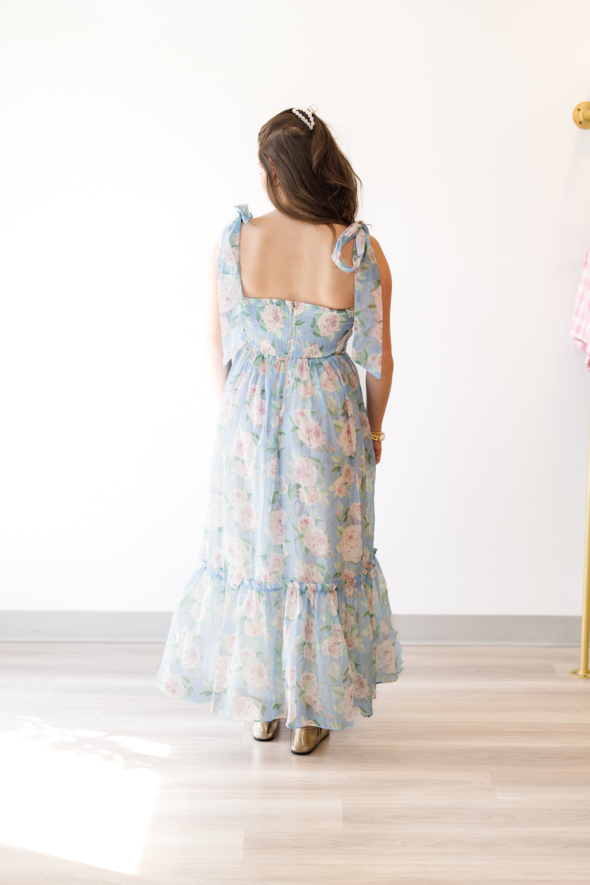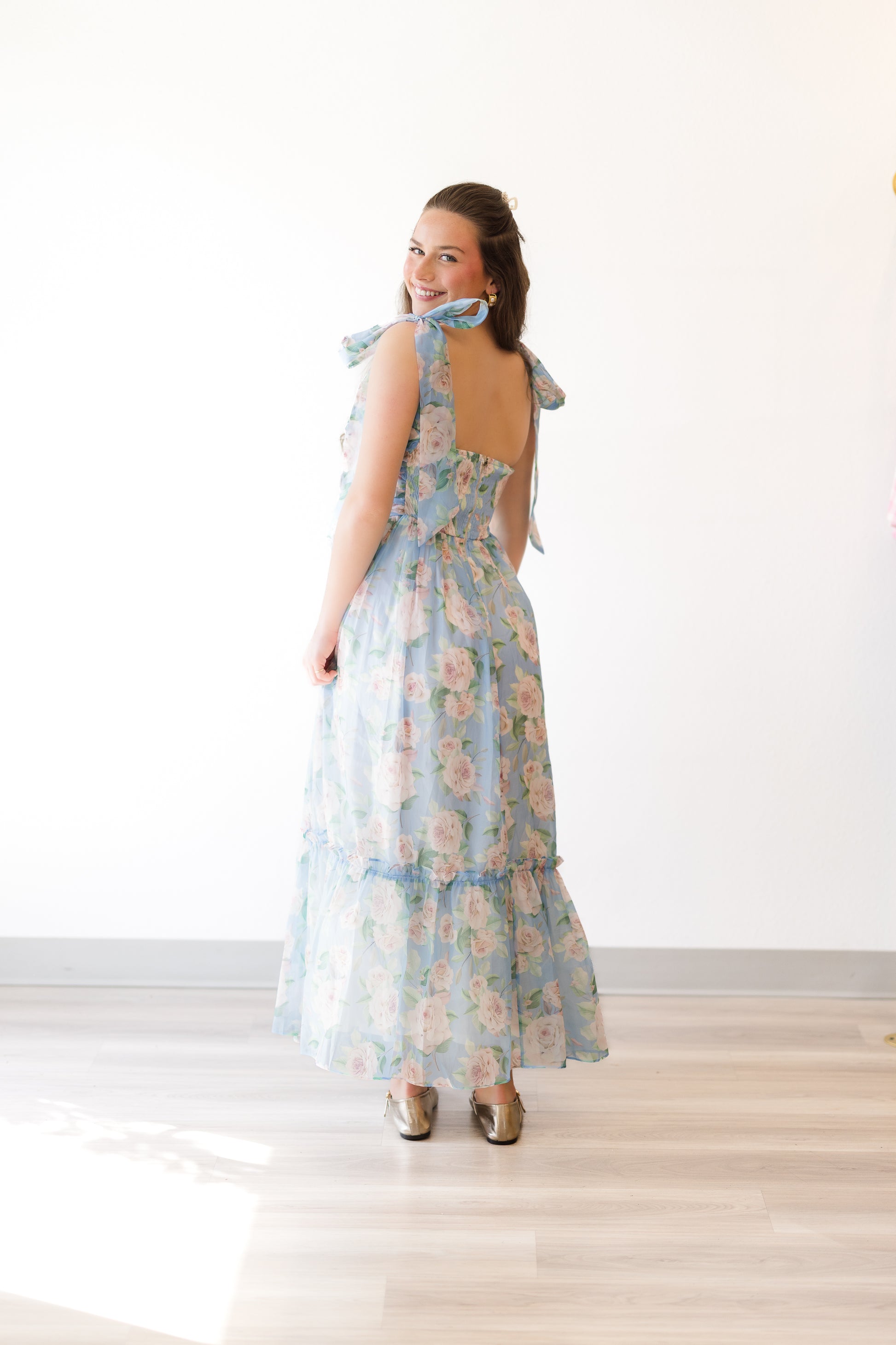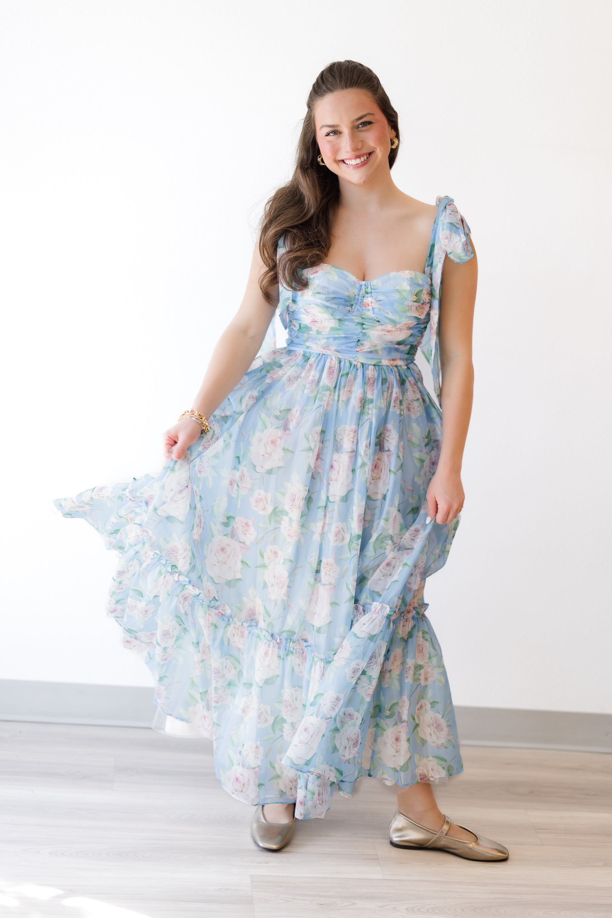 Delicate floral tiered, mini dress in pastel blue and blush. Perfect for a wedding guest and so mjuch more.