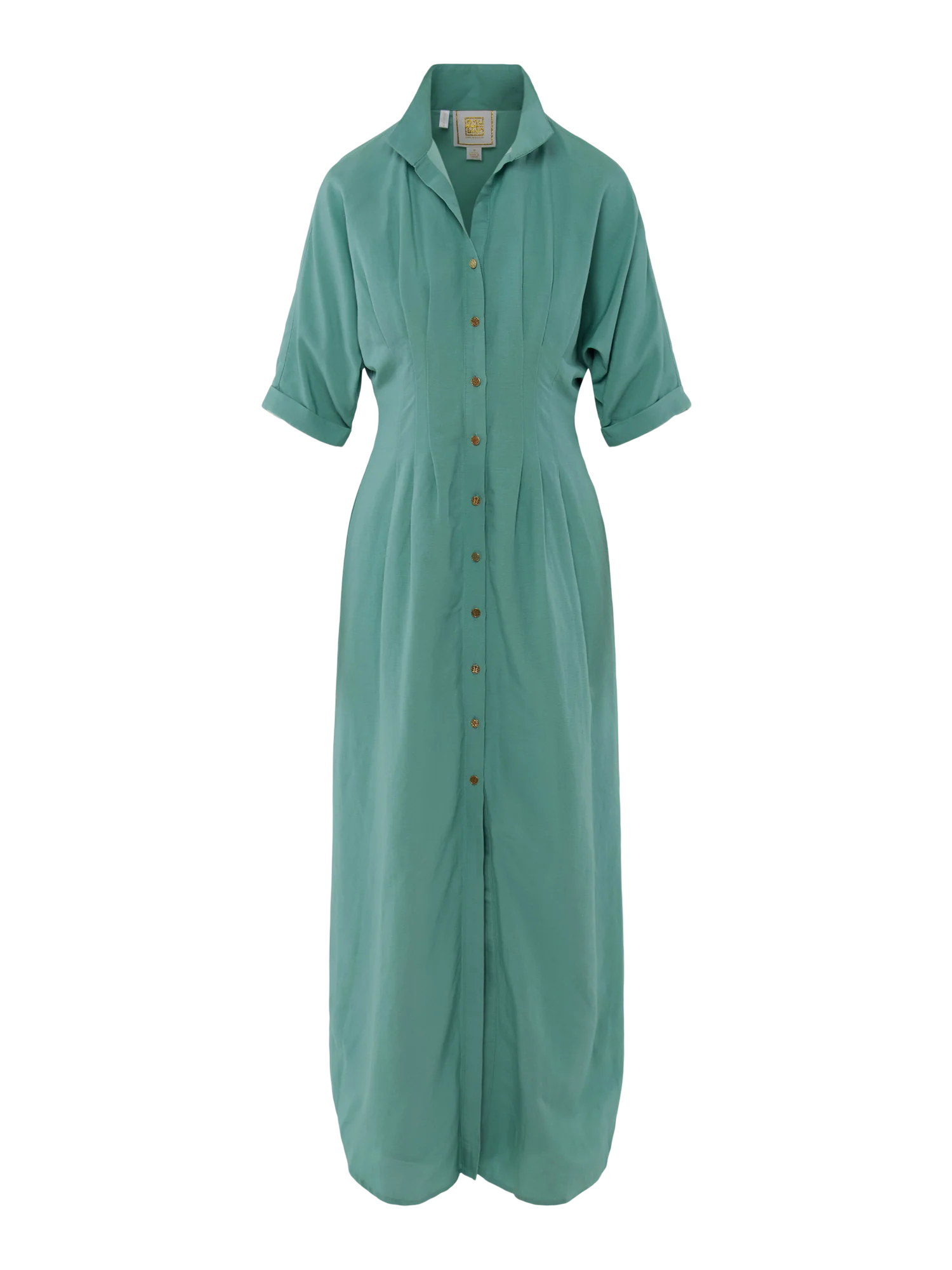 Timeless structure meets every day ease in the Georgia Dress Wasabi. Featuring a classic stand collar and short dolman sleeves, the design is finished with signature gold button closures down the front. Subtle pleating and an elastic back waist panel create a cinched, flattering shape with comfortable flexibility. Crafted in luxurious linen, this dress offers breathable wear with an elevated touch.