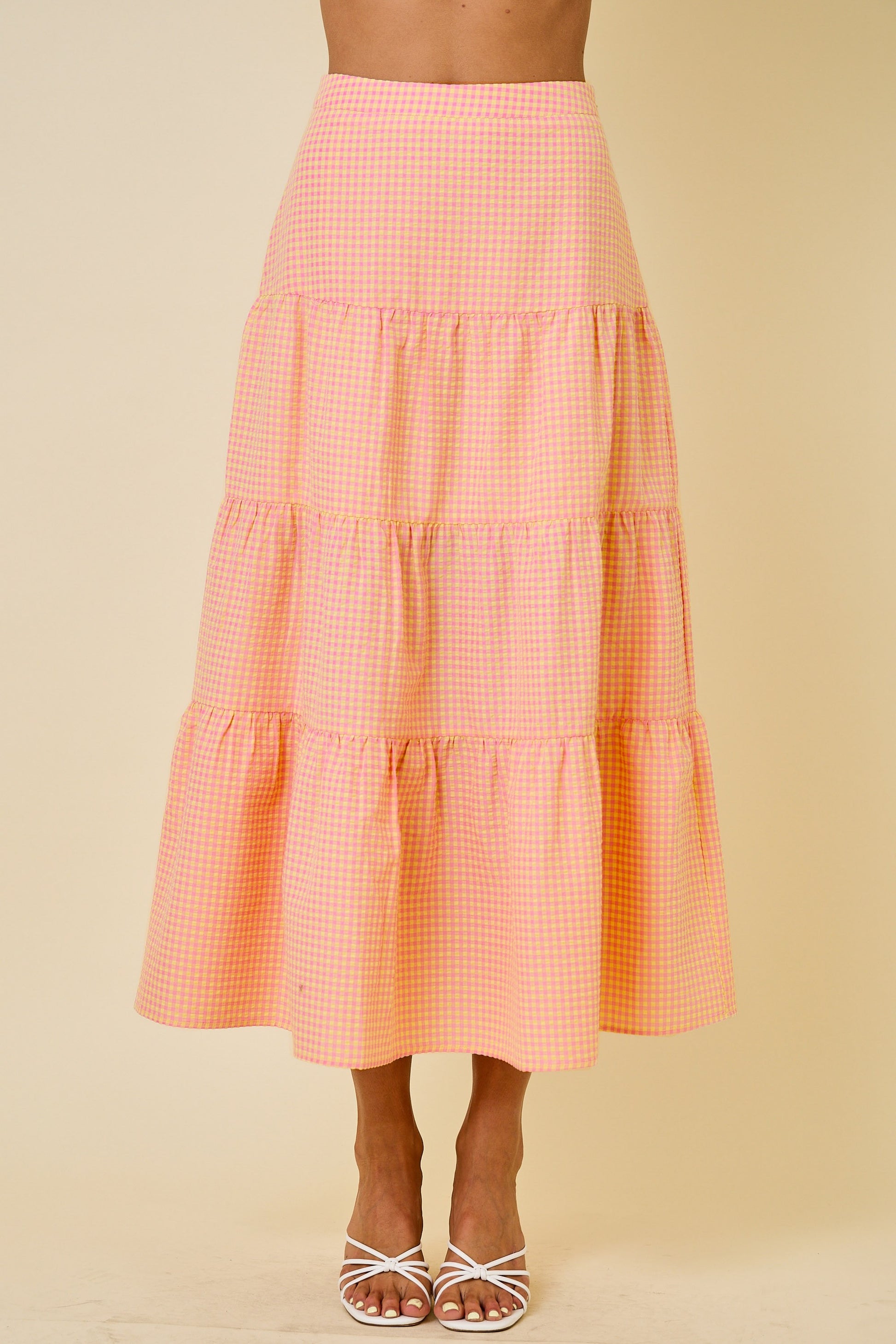 Gingham tiered, midi, maxi, long skirt with zipper in pink lemonade.
