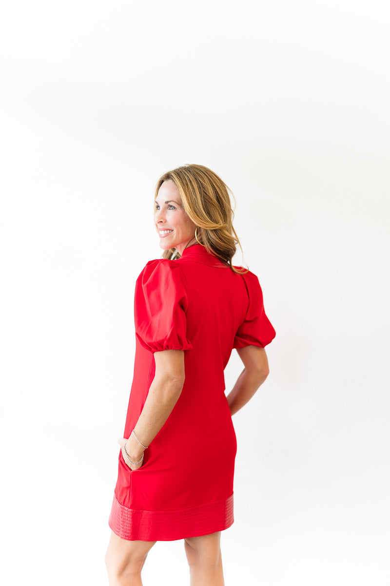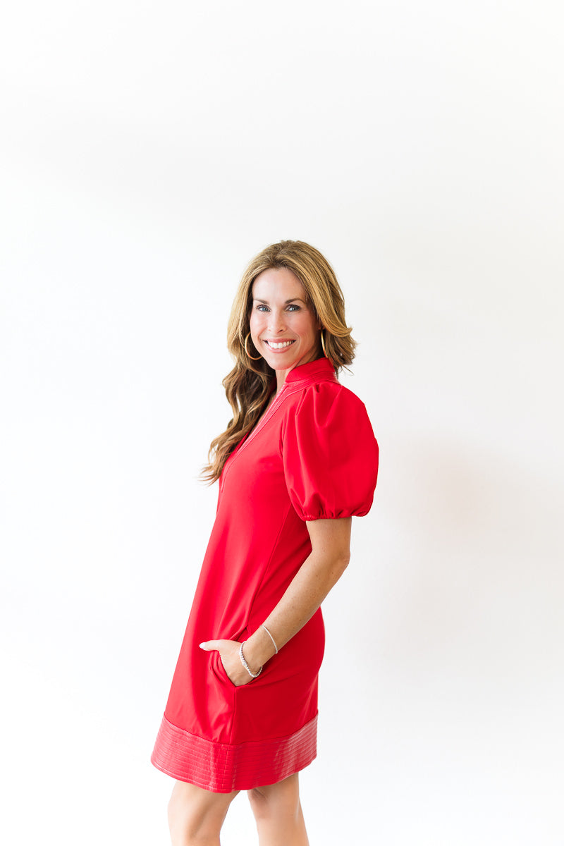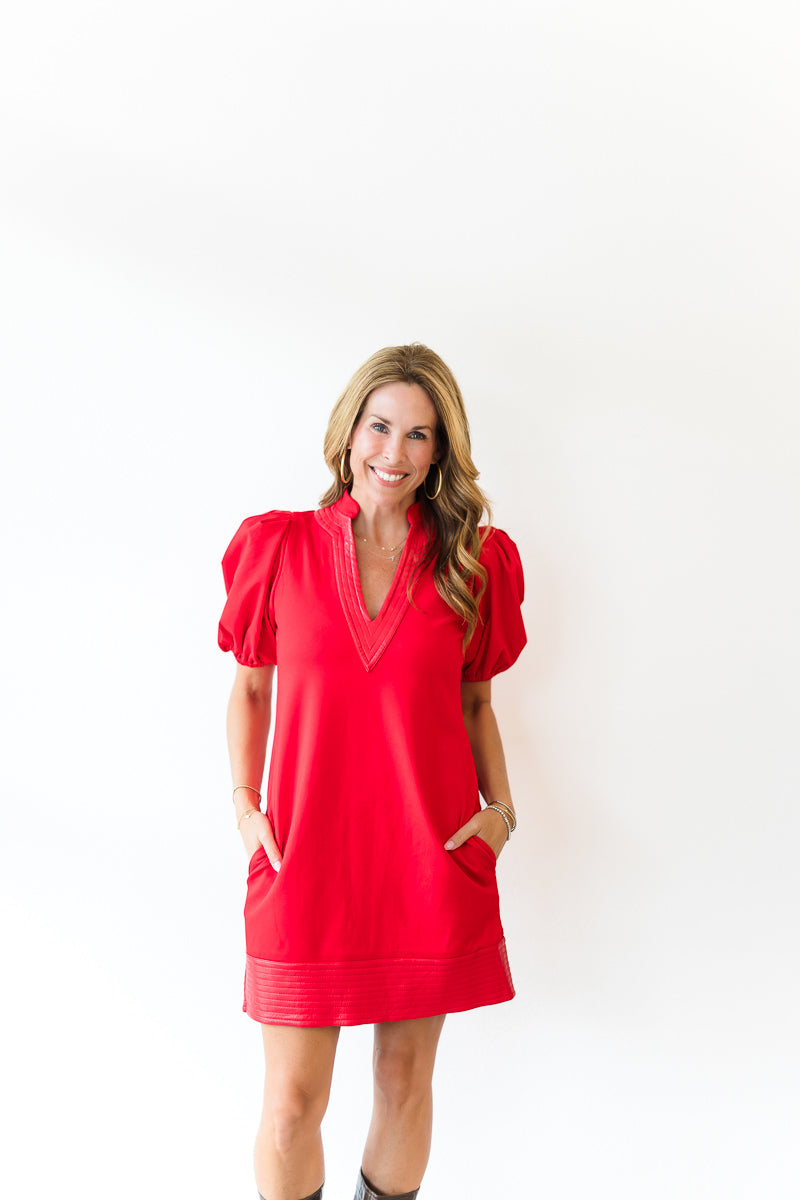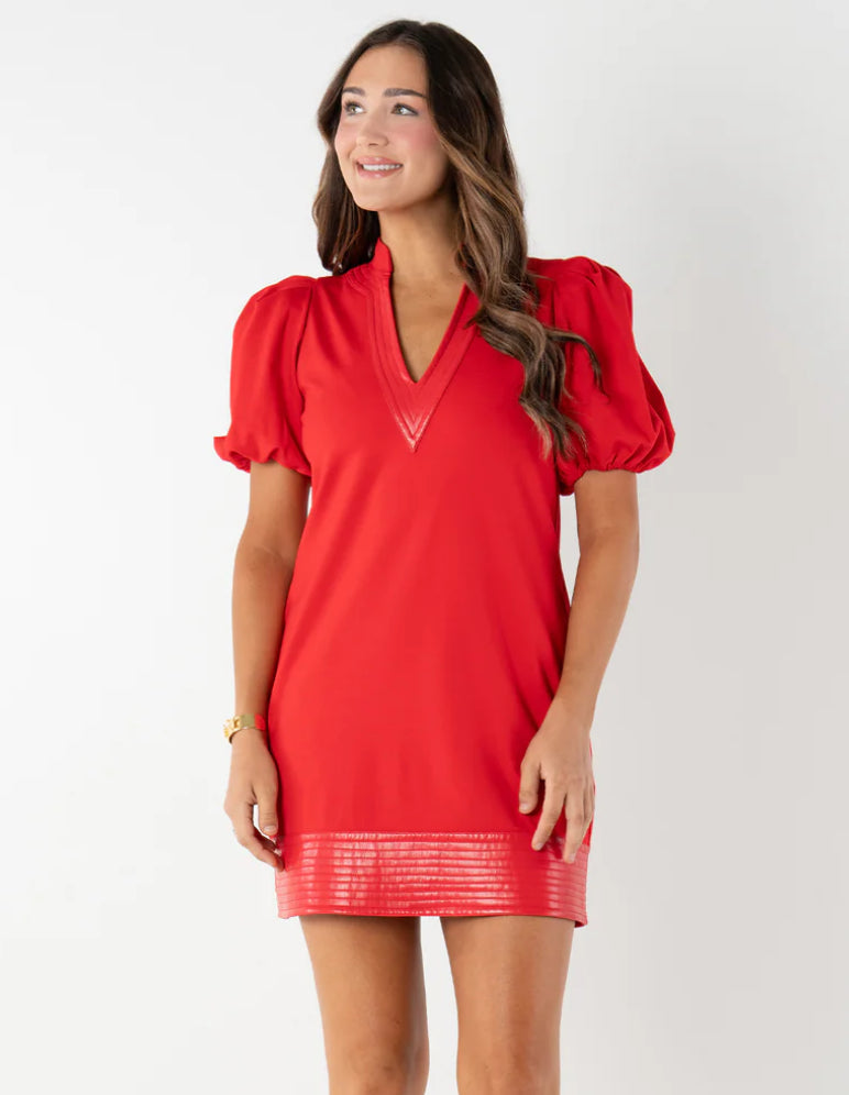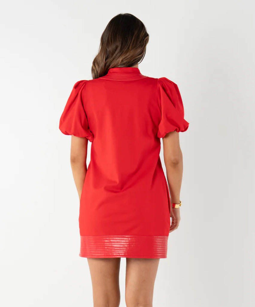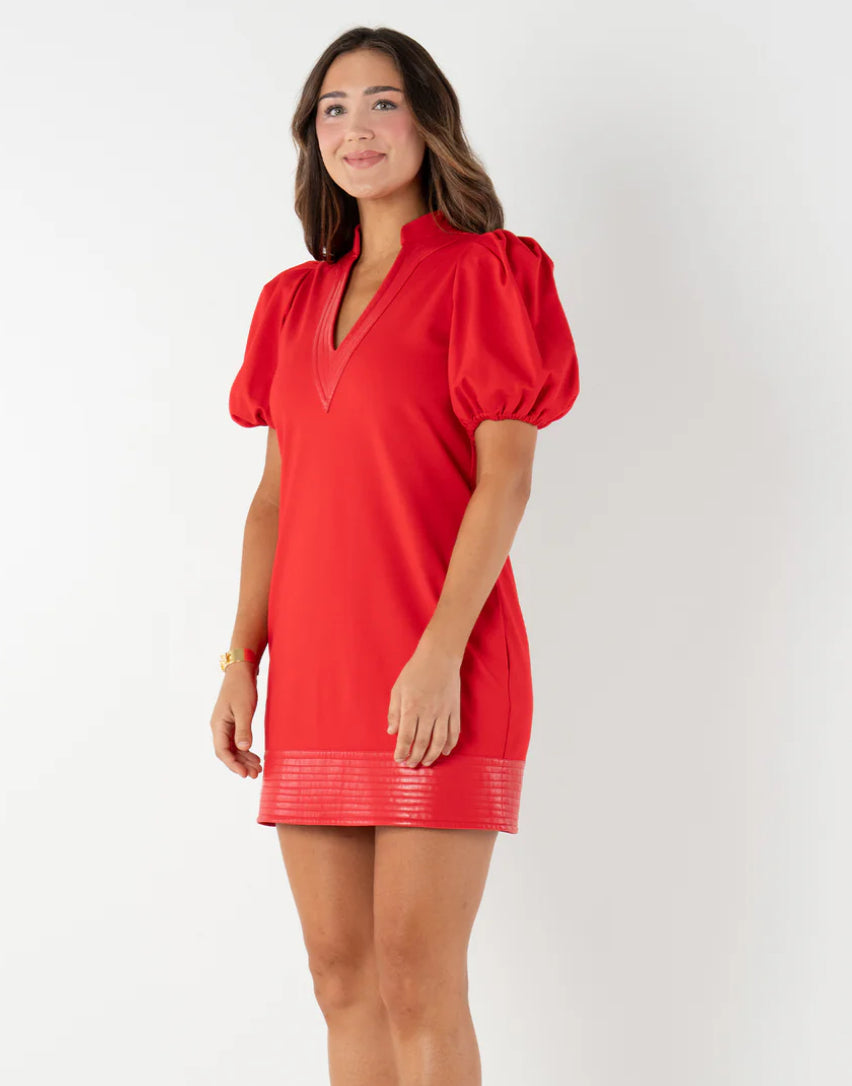 SIZE DOWN! The Hampton Mini in High Risk Red delivers a bold, modern statement with refined detailing. Featuring a mandarin-style collar, puff sleeves, and a slightly tailored fit, this silhouette is finished with side pockets for functionality. Vegan leather trim accents the neckline and hemline, adding a sleek textural contrast to the vibrant hue for a look that’s both elevated and unforgettable.