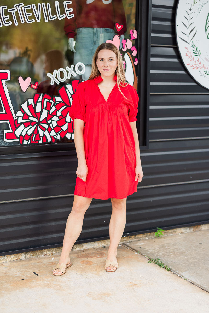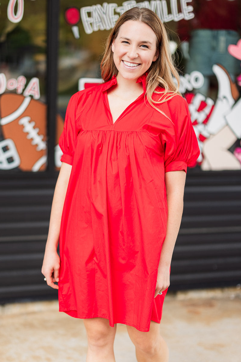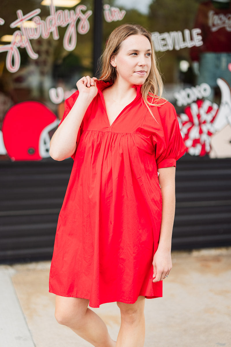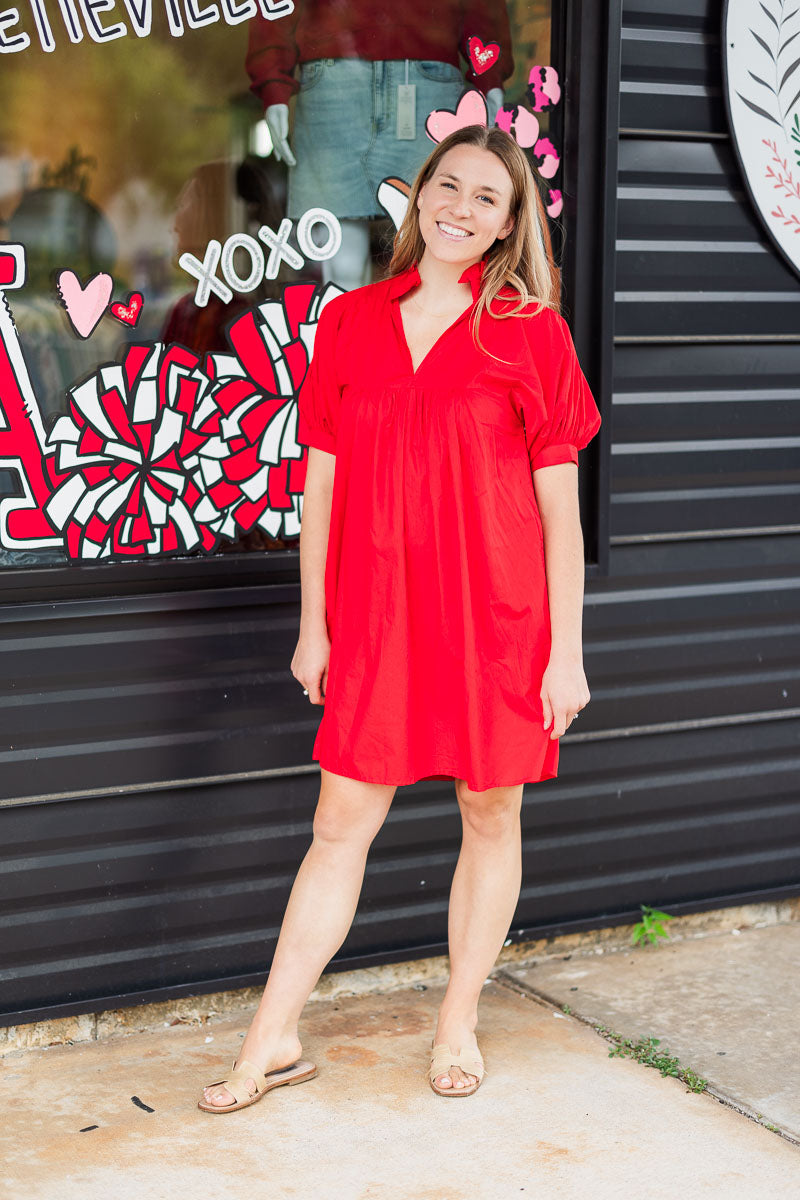 From our Game Day Collection, we would love to introduce you to our High Neck Dress available in True Red! This dress is going to turn heads at your next tailgate. Our High Neck Dress has a high neck ruffle, deep v-cut center, puff sleeves, and above the knee length! 100% Cotton Poplin Machine Washable, Air-Dry is recommended