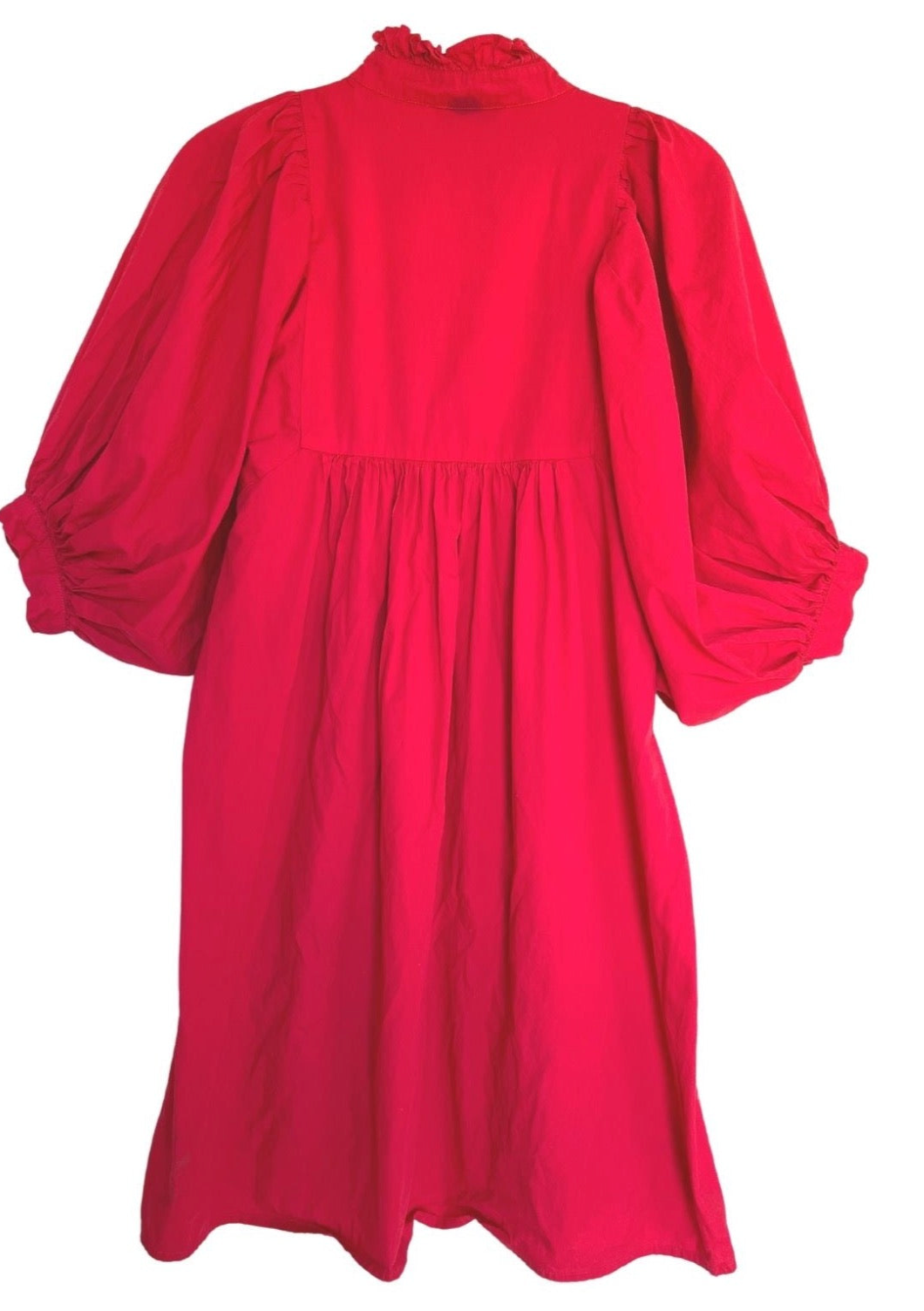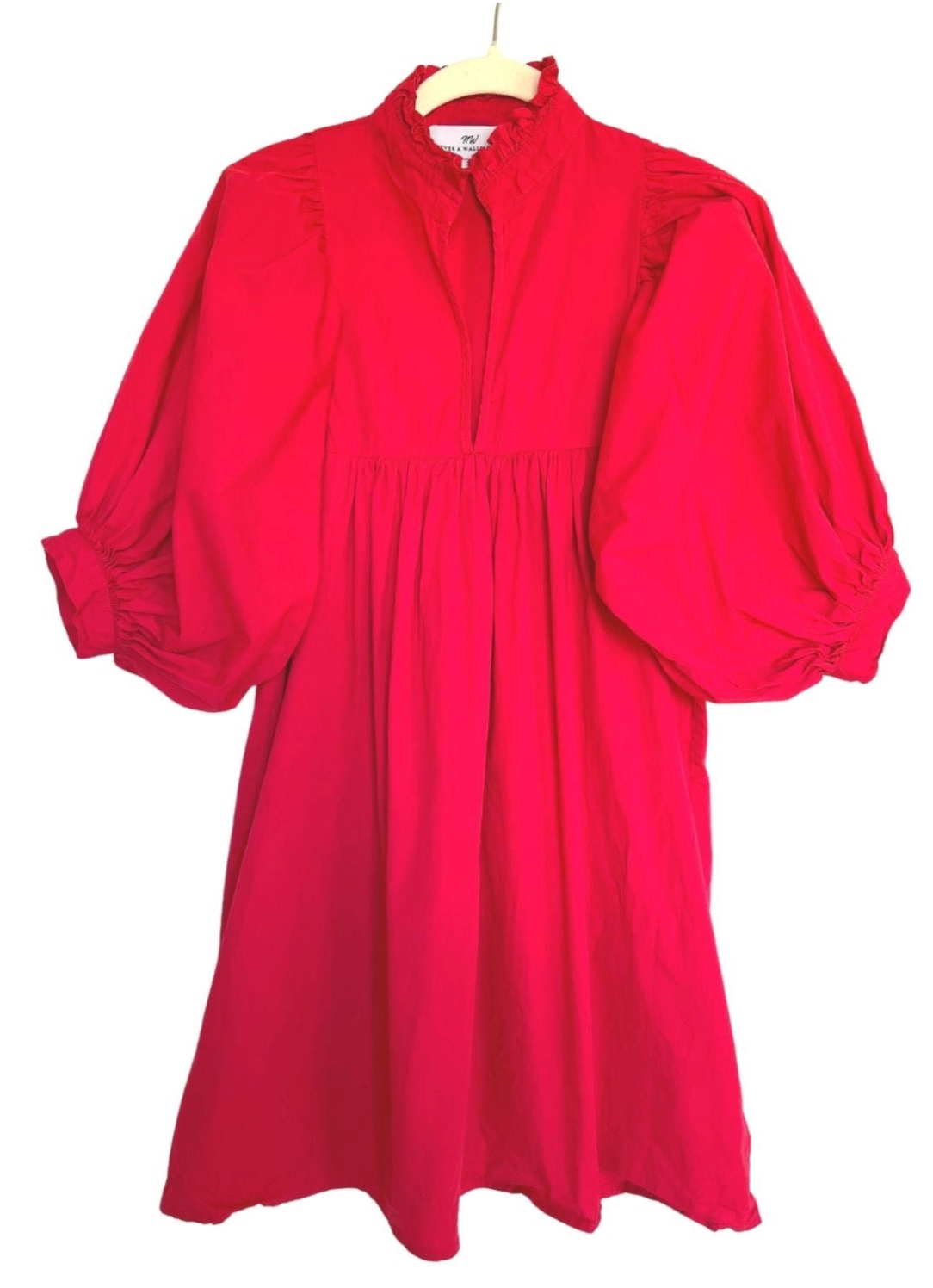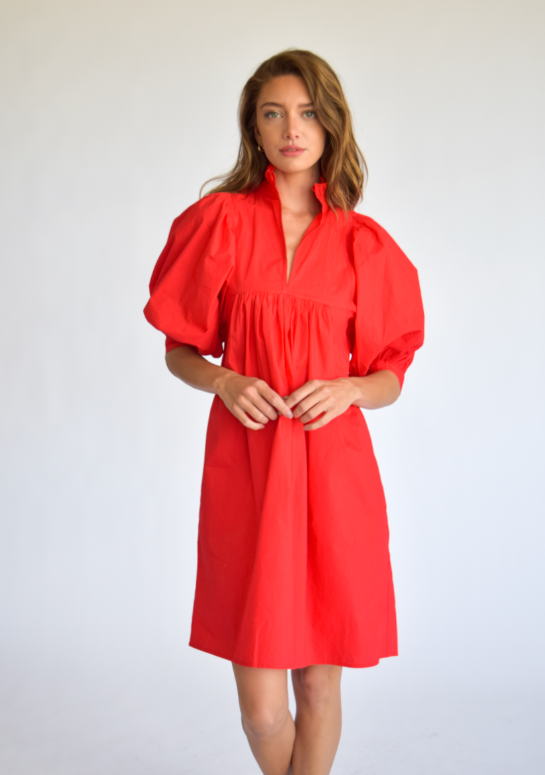 From our Game Day Collection, we would love to introduce you to our High Neck Dress available in True Red! This dress is going to turn heads at your next tailgate. Our High Neck Dress has a high neck ruffle, deep v-cut center, puff sleeves, and above the knee length! 100% Cotton Poplin Machine Washable, Air-Dry is recommended