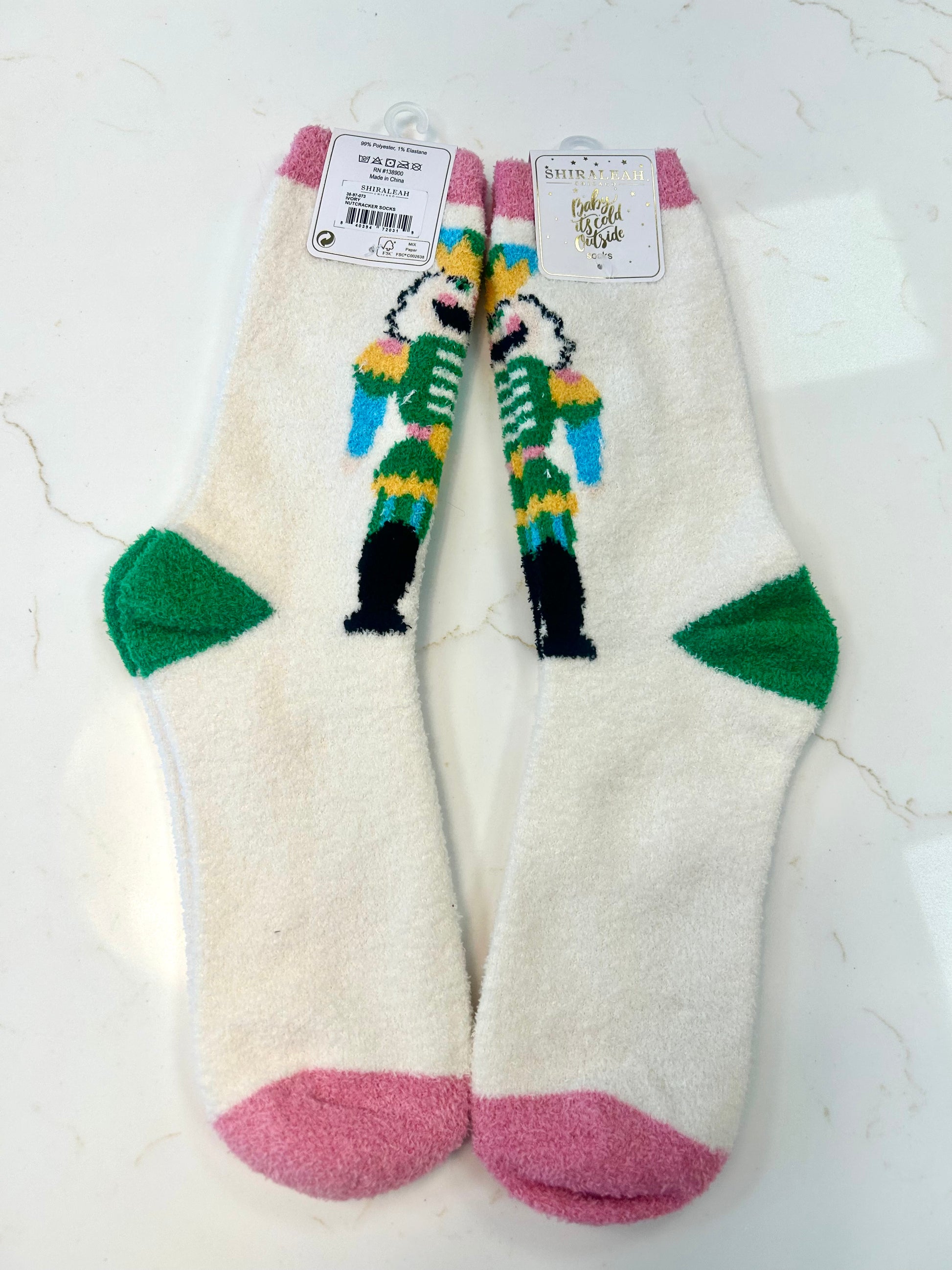 March into cozy holiday vibes with our Nutcracker Socks! Featuring a festive nutcracker design in cheery shades of green, pink, yellow, and blue, these socks bring storybook magic straight to your toes. With soft fuzzy fabric and a comfy fit, they’re perfect for lounging by the tree or twirling through your own winter wonderland. Finished with sweet pink accents at the cuff and toe, they’re a playful twist on a classic holiday icon. Made from polyester and spandex