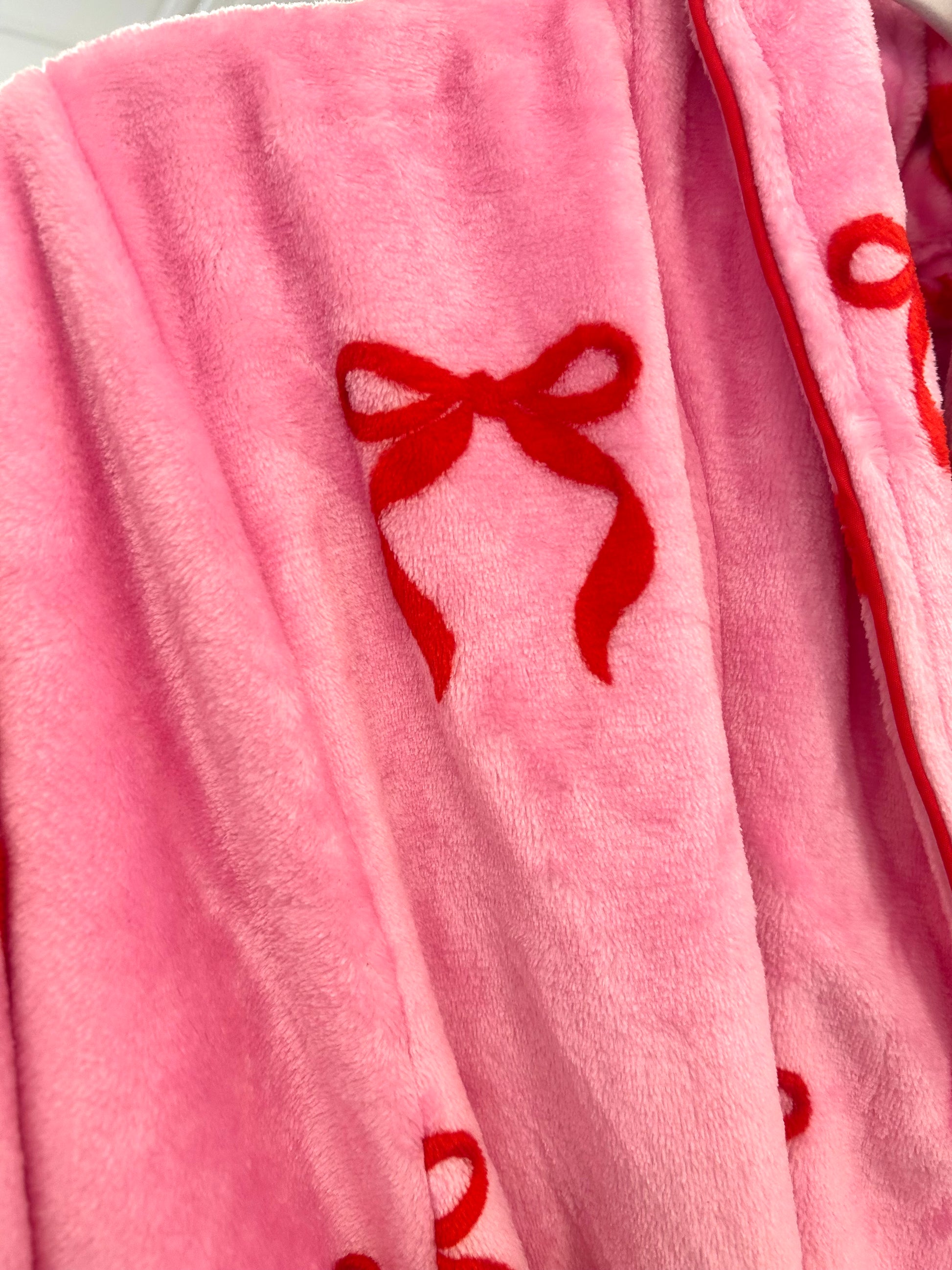 S/M: L 38”; L/XL: L 40”. Made from 100% polyester. Machine wash, tumble dry low, Wrap yourself in playful coziness with our Bow Robe, the perfect piece for lounging in style. Made from super soft fleece, this robe features a dreamy pink hue sprinkled with bright red bow prints for a fun, feminine touch. Complete with a tie belt and roomy front pockets, it’s designed for ultimate comfort and convenience. Whether you’re sipping coffee or opening gifts, this robe brings the cozy vibes all season long.
