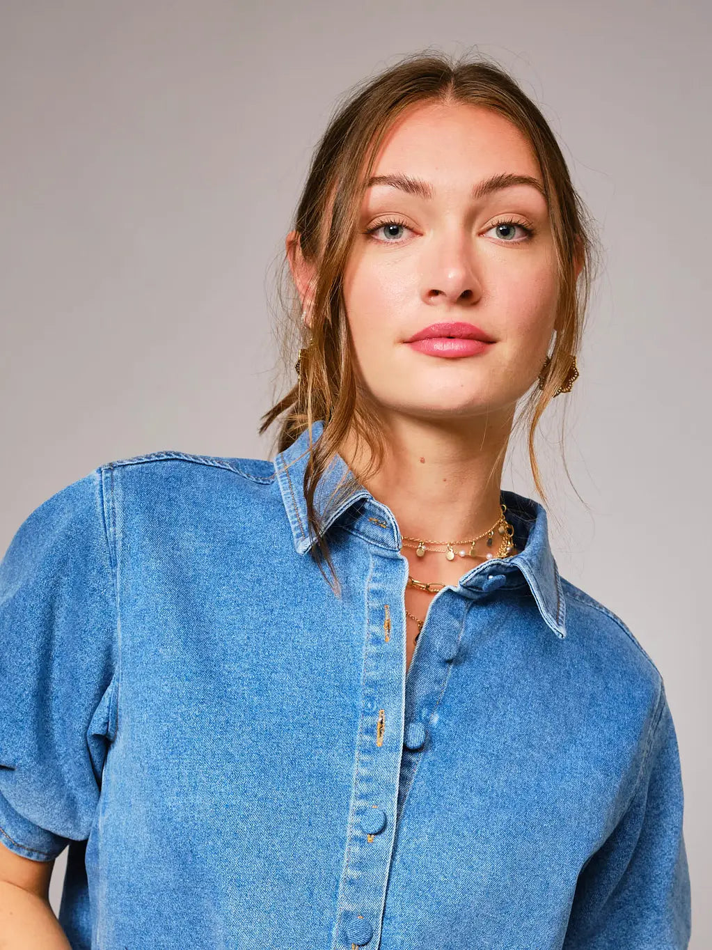 Puff short sleeve button down denim shirt. Boxy button down denim shirt with puff short sleeves, covered buttons, and a classic collar for a casual-chic look 85% Cotton, 14% Polyester, 1% Spandex Model is 5'8" tall and wearing size Small