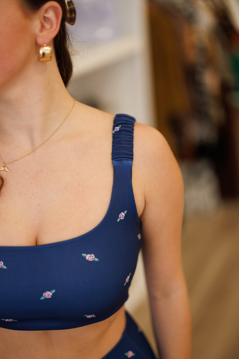Rose Print Ruched Bra Top. Bra top in rose print with removable padding, open-back detail, and scrunch straps for an adjustable, flattering fit. 82% POLYESTER 18% SPANDEX HPS S: 13" M: 13 1/2" L: 14