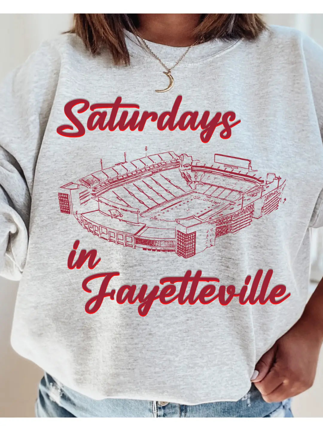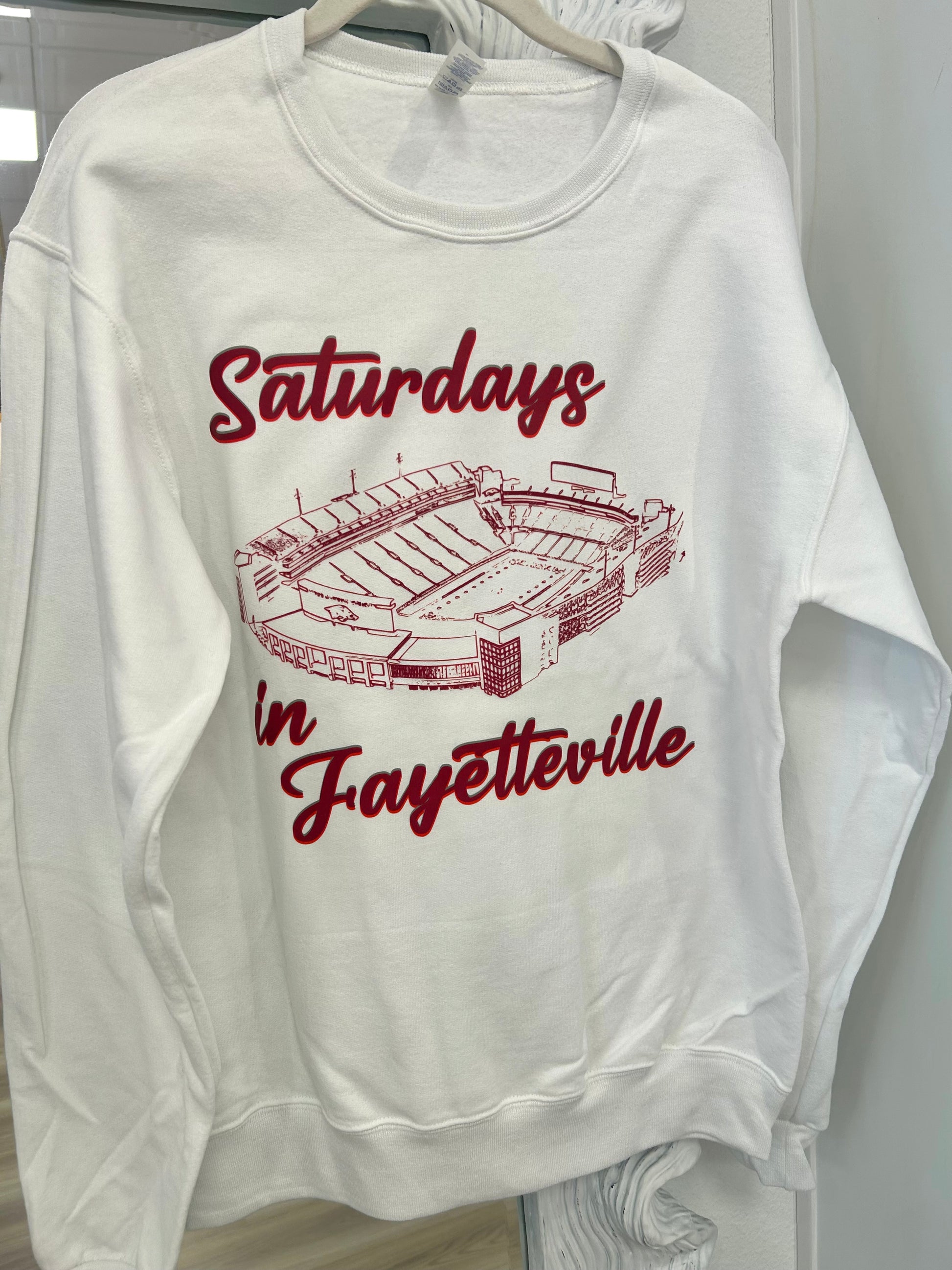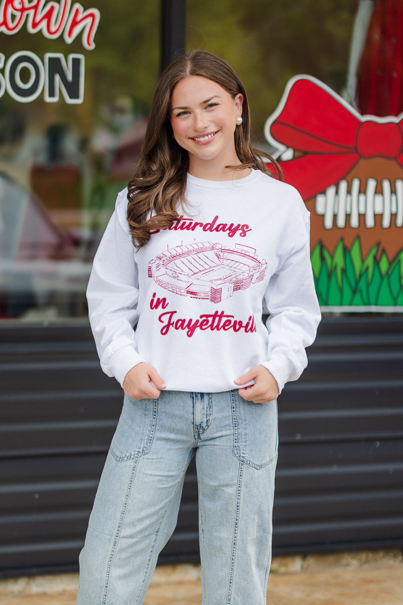 Saturdays in Fayetteville, Arkansas graphic sweatshirt in white.
