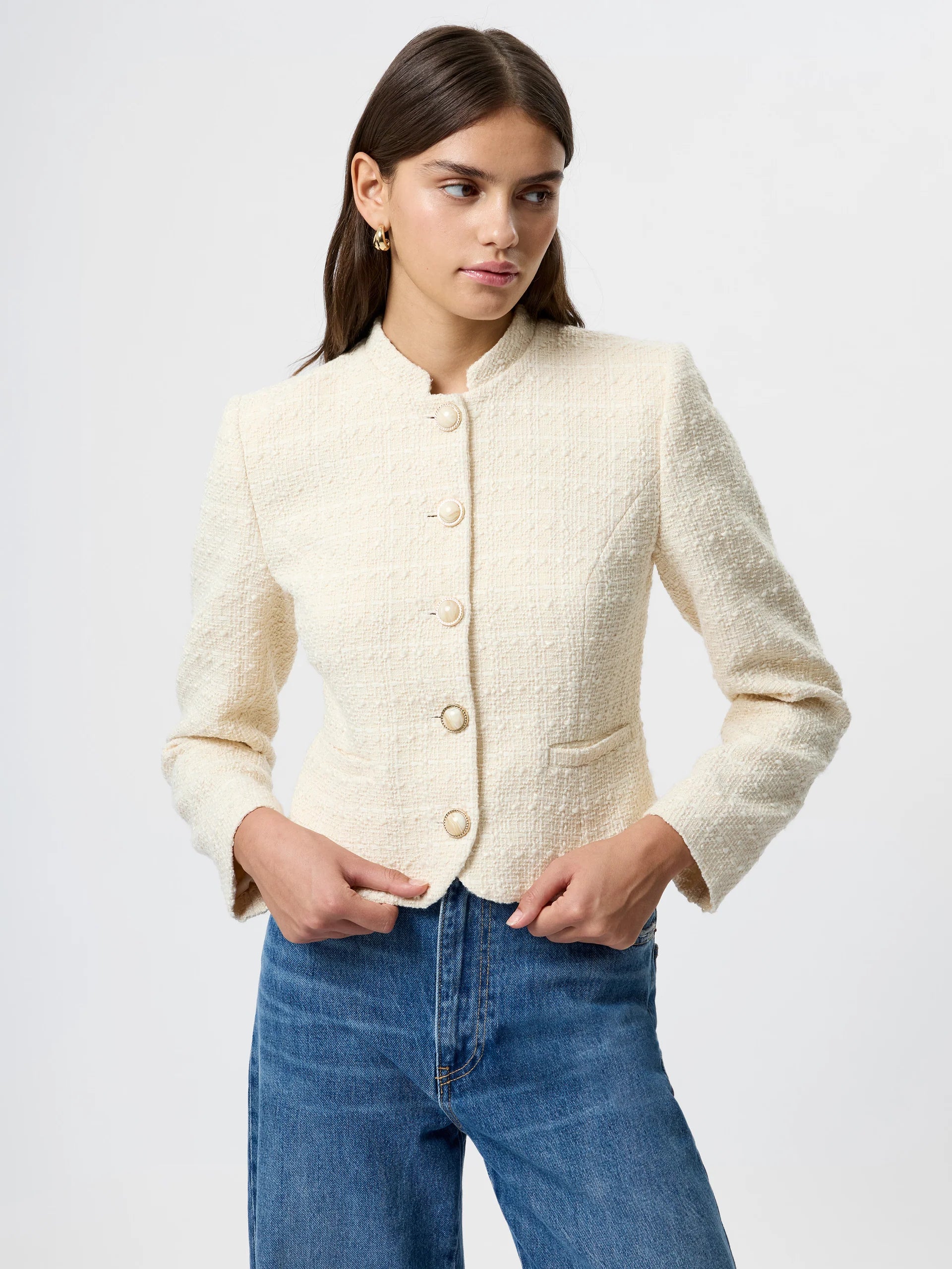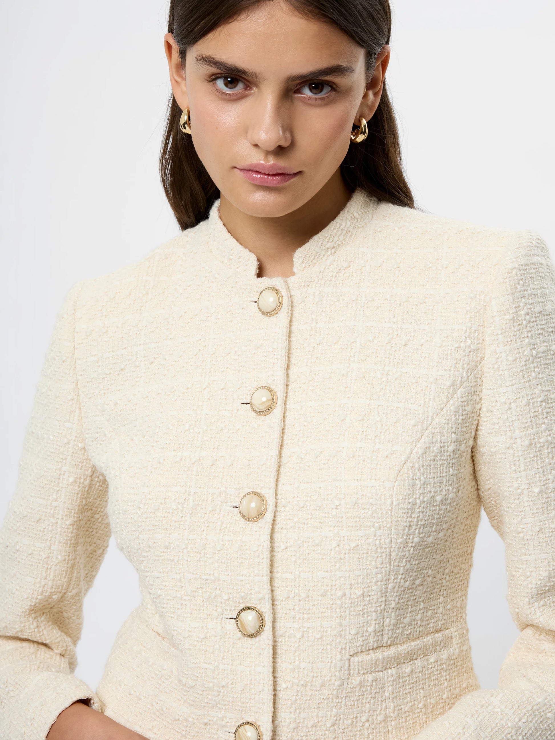 A tailored layer that means business (but still looks cool). This structured tweed jacket is designed with a slim fit, clean neckline, and statement buttons for a polished finish. Wear it solo with denim, or pair it with the matching Structured Tweed Curved Shorts for a coordinated look that feels fresh and put-together.