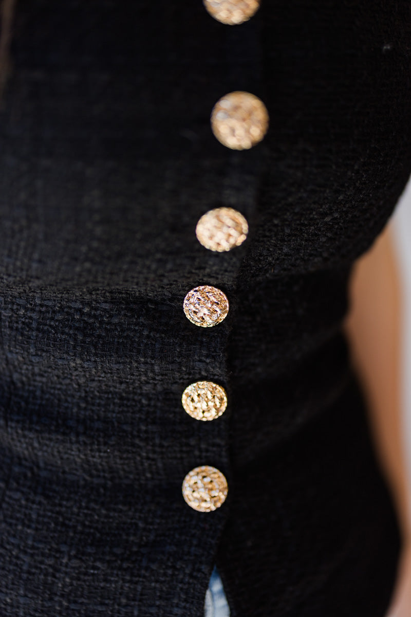 Textured tweed meets contemporary tailoring. The Structured Tweed Strapless Top hugs the body in all the right ways, with gold button accents and a fitted, fully lined design. A versatile piece for everything from brunch to evening plans.