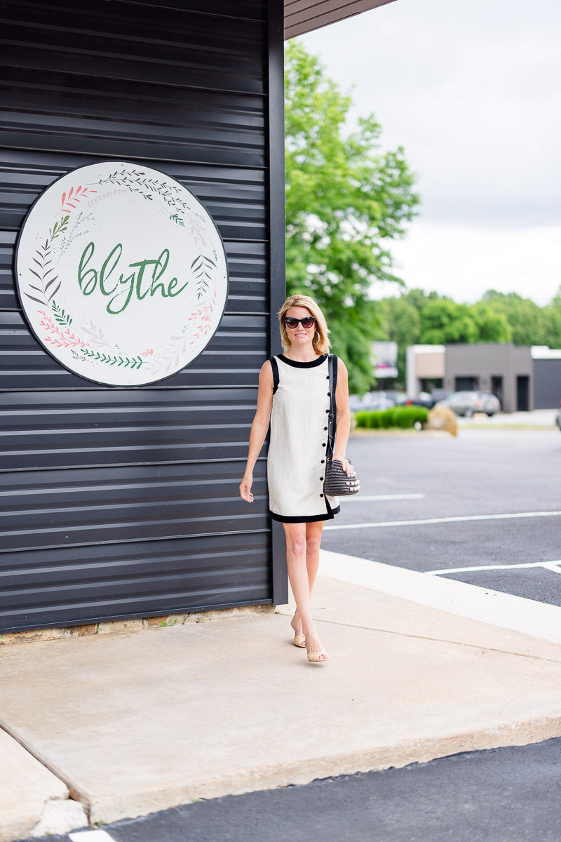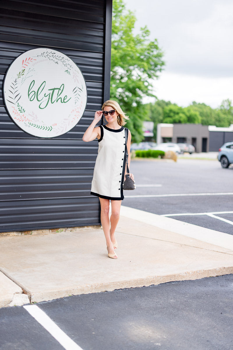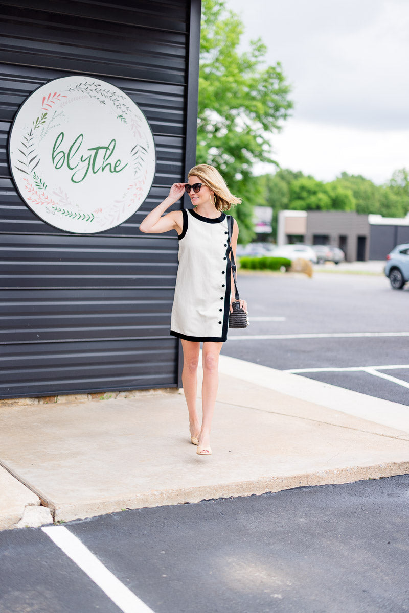 The Tory Tunic Dress in Birch is the wardrobe staple your closet’s been waiting for. Crafted from luxurious linen, this dress showcases a sleek straight silhouette, refined round neckline, and a row of covered buttons that trail down the front side for a touch of polished charm. Framed with contrast trim in classic black and ivory, it’s a neutral go-to that transitions seamlessly from day to night. Dress it down with sandals and sunnies or elevate it with heels and statement jewelry—the styling possibilities are endless!